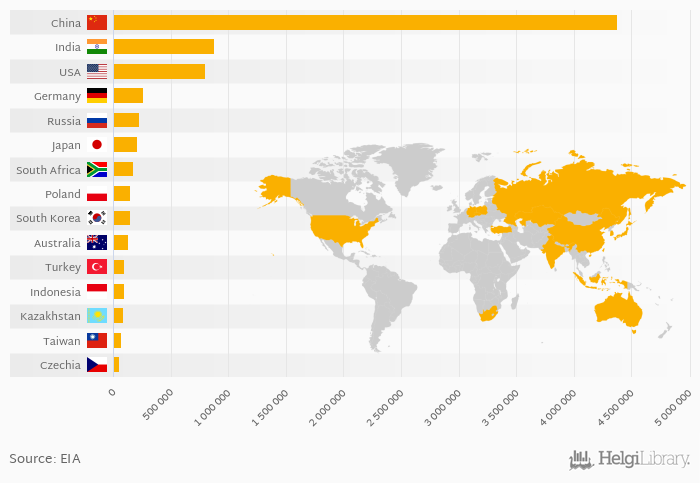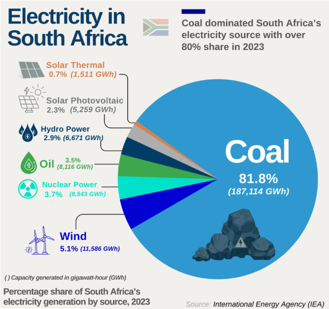 South Africa is the most reliant on coal with it accounting for over 80% of their energy.