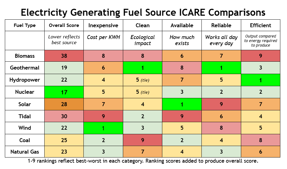 - Once a nuclear plant is built and the fuel is mined and enriched, nuclear provides a super reliable and efficient energy source giving it an overall 1st place ICARE ranking.