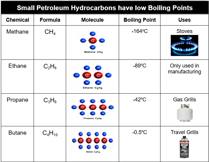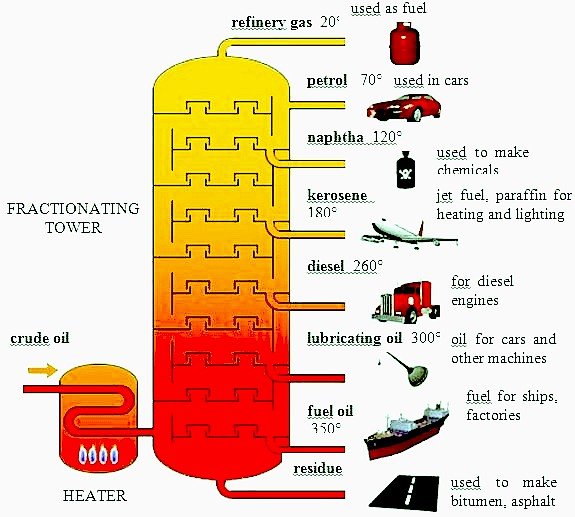 - When petroleum is slowly heated, the different sized molecules speeding up and boil at different temperatures.
