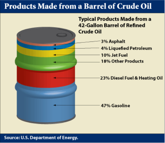 - As you can see, the majority of a barrel of crude oil is refined into liquid fuels for transportation like gasoline, diesel and jet fuel.