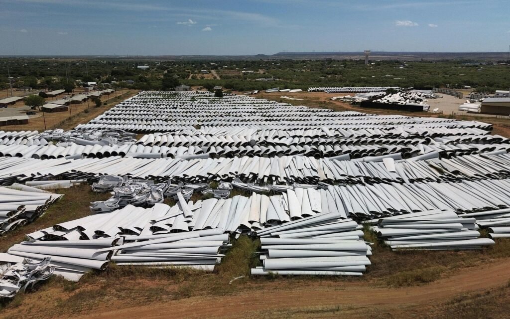 - Because the blades are made of several materials glued together, they can’t be recycled and are piled up or buried.